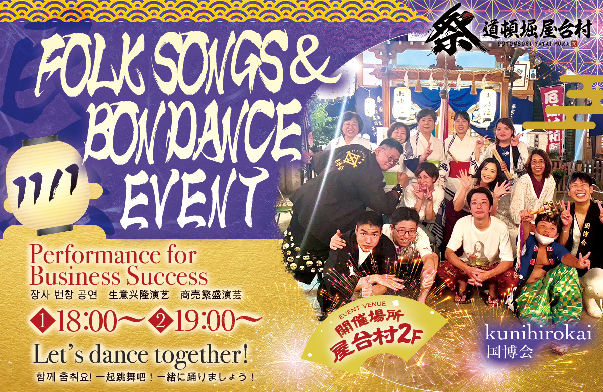 この秋、道頓堀 屋台村 祭にて、民謡と盆踊りの公演が開催されます!出演は、日本の伝統文化を現代に伝える活動を続ける「国博会(くにひろかい)」の皆さん。誰でも気軽に楽しめる内容となっておりますので、ぜひご参加ください!