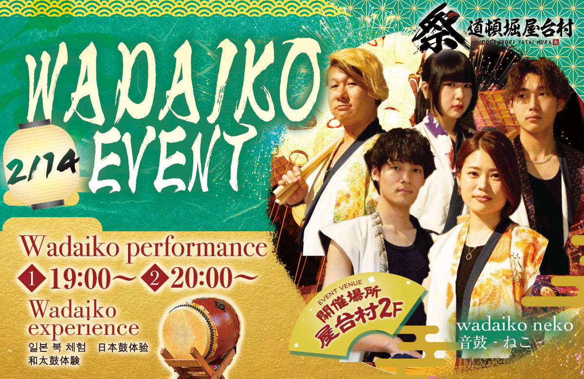 2025年2月14日(土)、道頓堀 屋台村 祭にて、和太鼓ユニット「音鼓‐ねこ‐」様による迫力満点の演奏と、参加型の和太鼓体験イベントを開催いたします!